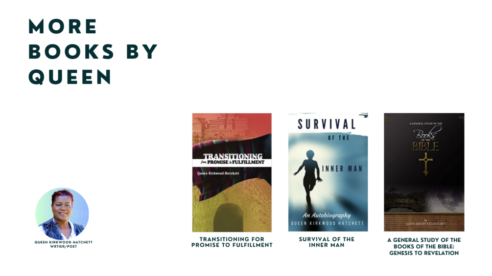 Queen Kirkwood Hatchett is a poet and writer who has self-published most of her written works, including A General Study of the Books of the Bible, Transitioning from Promise to Fulfillment, and her memoir, Survival of the Inner Man. Her most famous poem, Crack: The Drug from Hell, from her first publication, From the Heart: A Book of Poetry(©️1994 Hodale Press), opened many doors for her. She has received a host of plaques, awards, and certificates for her dedication to the community and Body of Christ, her writings, and her volunteer services. A survivor of childhood sexual and physical abuse, Queen is a creative artist who doesn’t separate her faith from her life’s work. When she is not writing, she enjoys time with family and friends or making something with her hands.